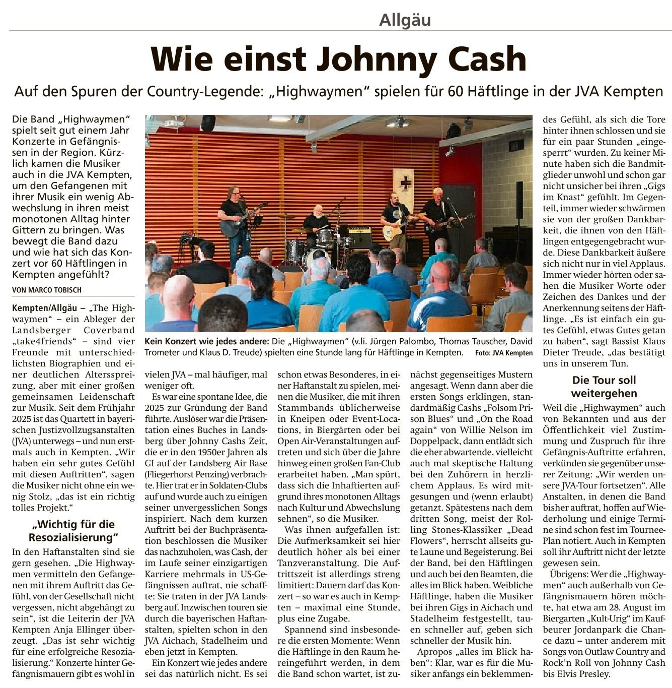 Es war eine spontane Idee, die 2025 zur Gründung von „The Highway Men“ führte, einem Ableger der Landsberger Coverband „take4friends“. Die vier Musiker holten das nach, was Johnny Cash, der in den 1950er Jahren als Soldat in Landsberg stationiert war und später mehrmals in US-Gefängnissen auftrat, nie schaffte: Sie traten in der JVA Landsberg auf. Inzwischen sind sie auf Tour in bayerischen Haftanstalten, spielten bereits in den JVA Aichach, Stadelheim und Kempten auf.